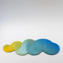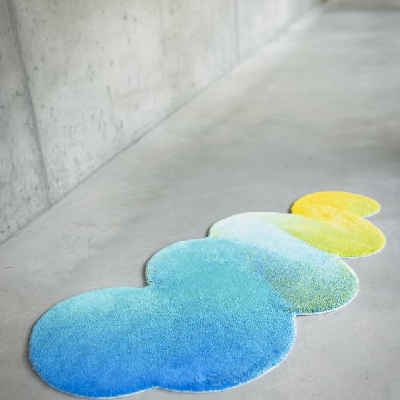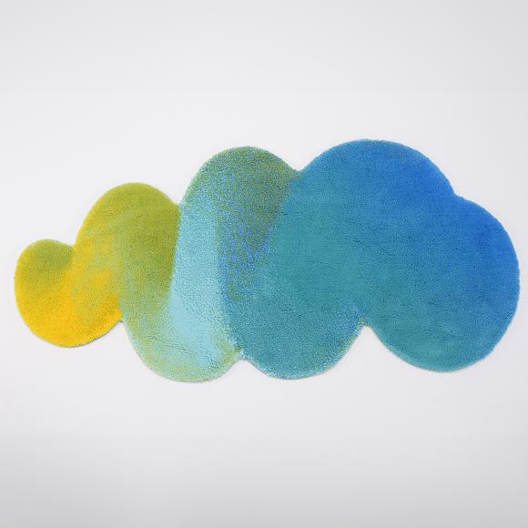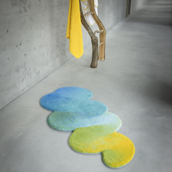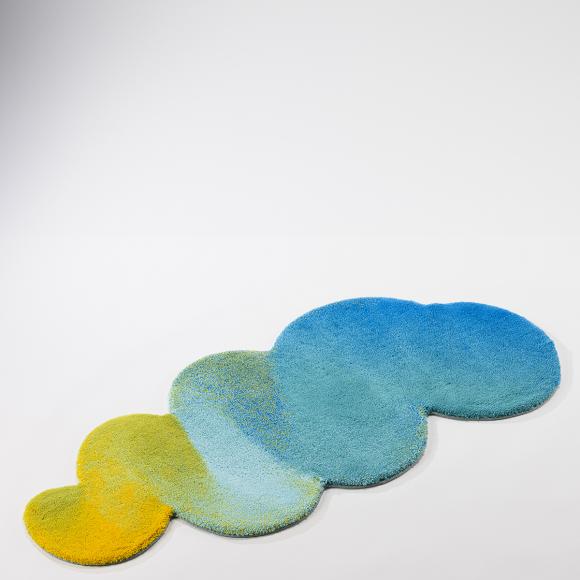 The Odity bath rug features a vibrant and artistic design, with a beautiful gradient of blue, greens and yellow that evoke the calming essence of the ocean. Its unique, undulating shape adds a playful yet sophisticated touch to your décor, making it a standout piece in any setting.