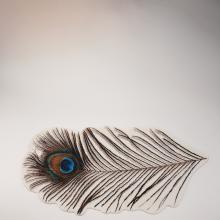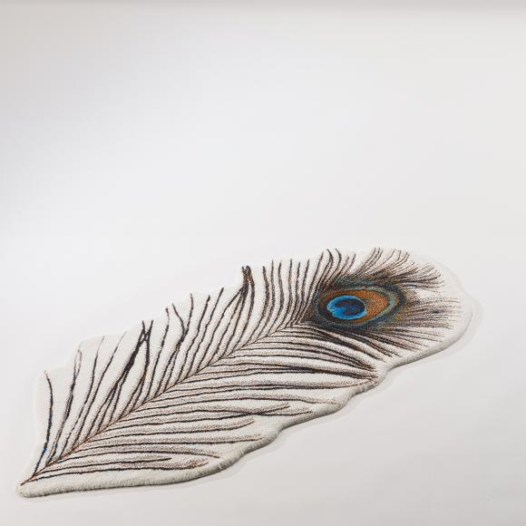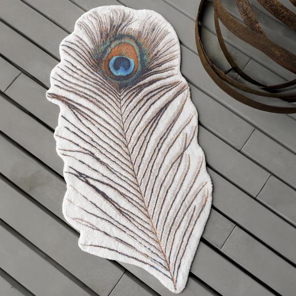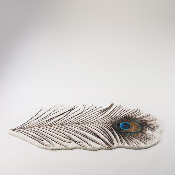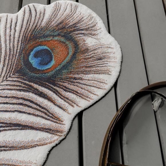 Measuring 80 cm x 160 cm, the Paon bath rug is generously sized to make a bold statement in any bathroom. The design features a meticulously detailed image of a peacock feather, with the intricate eye-catching pattern beautifully replicated in vibrant shades of colour on an ivory background. The rug's edges are cut out to follow the natural shape of the feather, adding an artistic and unique touch to its overall appearance.