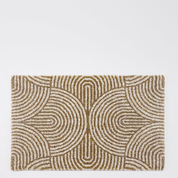 The rug features a symetrical overlayered design and is available in two popular sizes.