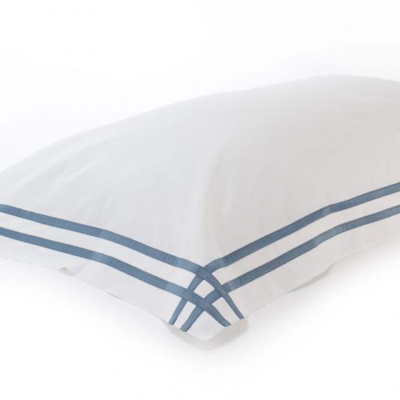 Criss Cross features two sets of two tailored ribbons of fabric (you can choose to contrast the colours or use the same). The detail is featured around the the duvet cover and pillowcase, offset from the oxford border, and is used across the top and upper sides of the flat sheet. We recommend using a single colour for a classic look or mixing the colours (you can use up to four) for a truly personal modern look.