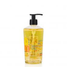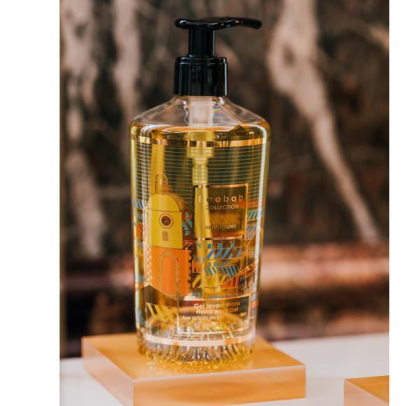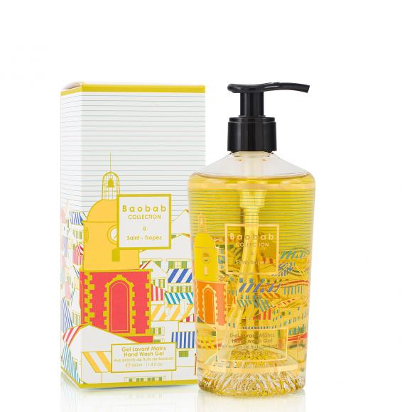 Presented in a glass bottle covered with a gold and coloured silk-screened print featuring a stylized version of the mythical village of St Tropez. The design’s transparency reveals a sunny yellow hand gel in a gourmet look. Its moisturizing and soothing formula will leave a perfumed veil on your hands, a soft and cleansed sensation.