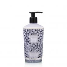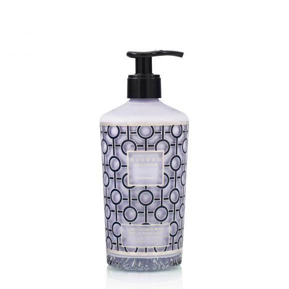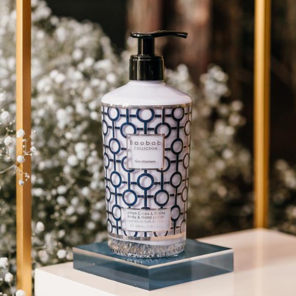 The Gentlemen scented hand and body lotion is housed in a bottle decorated with a navy blue and platinum silk-screened print, featuring a graphic and geometric pattern.
