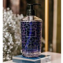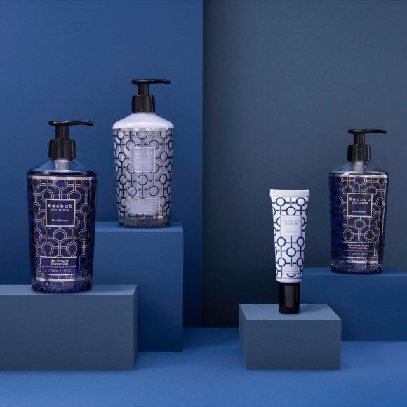 Presented in a glass bottle decorated with a navy blue and platinum silk-screened print, using a graphic and geometric pattern. The bottle reveals a deep blue texture, which reinforces the hand wash gel’s aquatic look.