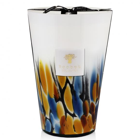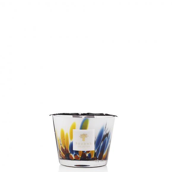 The Mayumbe scented candle is made with a hand-blown glass by our glass craftsmen, scattered with colours ranging from duck blue to saffron yellow.