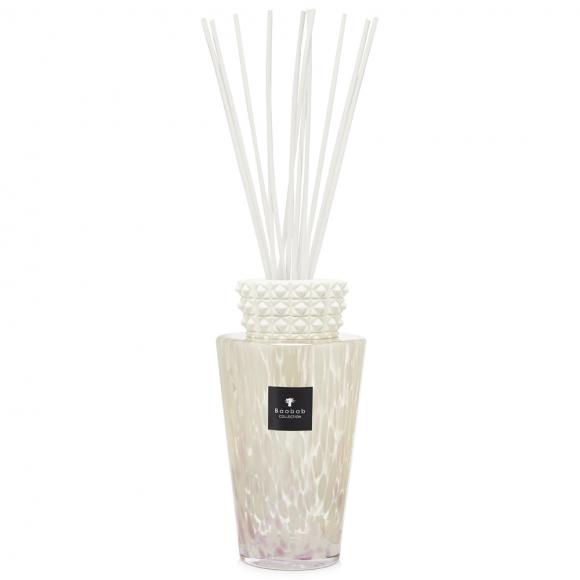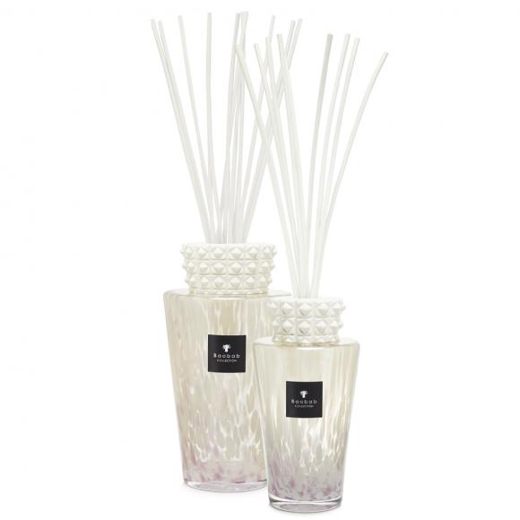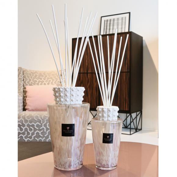 The Totem White Pearls diffusers glass contains white and powder pink details. The glass artisans’ dexterity means that each bottle is one of a kind.. Its matte white ceramic cap, sculpturally alluring, can delicately be placed on the bottle as an adornment that gives it a refined presence.