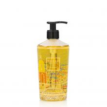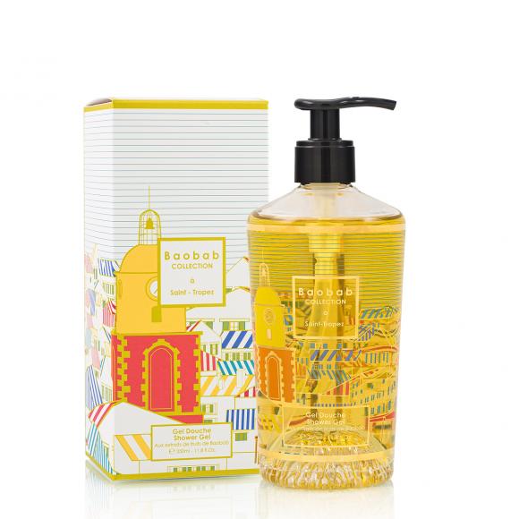 Presented in a glass bottle covered with a gold and coloured silk-screened print featuring a stylized version of the mythical village of St Tropez. Through the design’s transparency, a bright yellow shower gel appears, making it ideal for a shower niche or on the edge of a bathtub, as a decorative object in its own right.
