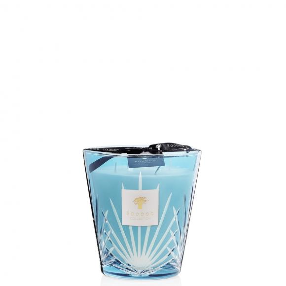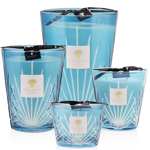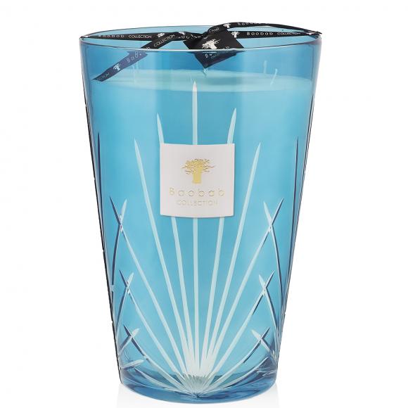 The West Palm scented candle is poured in a hand-blown turquoise glass, engraved with a motif reminiscent of the iconic palm leaves. Handcrafted in our workshops, the graphic motif is revealed via transparency and comes to life by the glow of the flame.