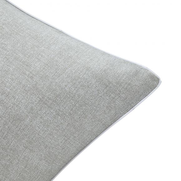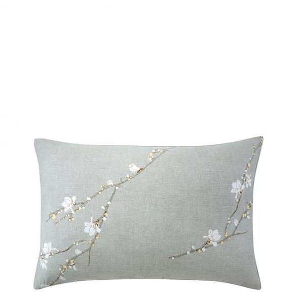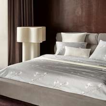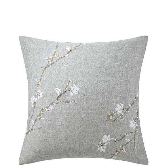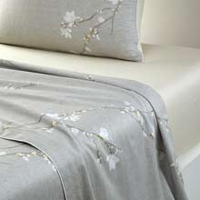 A subtle and feminine design, Almond Flowers features long branches in Spring bloom. Printed on a storm-grey texture-effect background. The Almond Flower buds and petals contrast against the background, standing out with a milky tint against the grey fabric. An optical white piping is also showcased on the pillowcases and flat sheet, illuminating the design and outline with a sharp contrast.