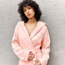 This chic bathrobe has a casual fit and alludes to the overall sportswear-inspired theme of the Plain collection with its hooded short design, falling just in the middle of the thighs.