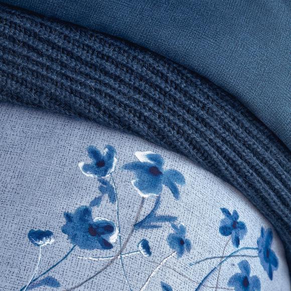 This design features slender flax flowers, subtly tinged with pale blue. Depicted with a light touch, they create a sober and natural design, against a textured Nordic blue background.