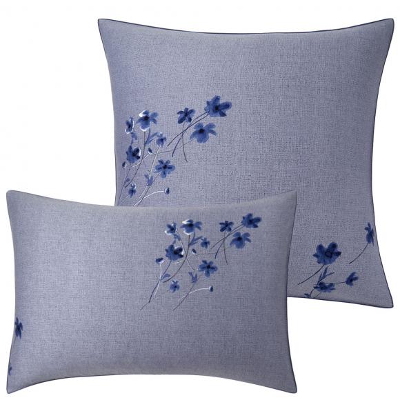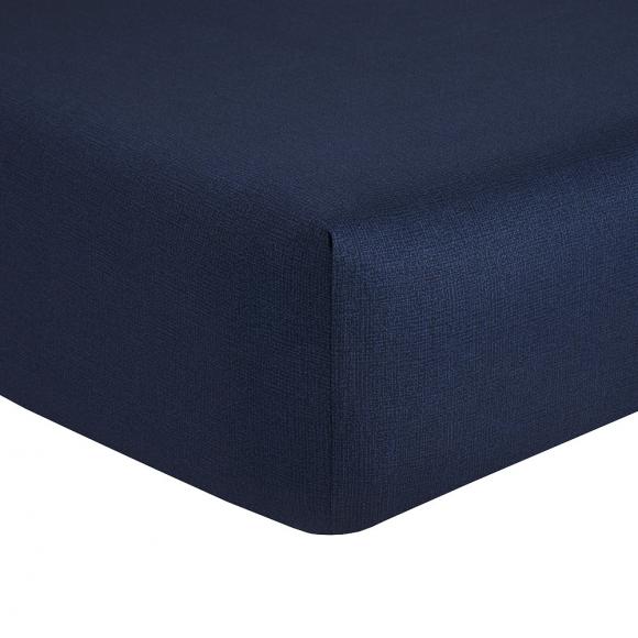 On the reverse side, a canvas effect in deep indigo adds a contrast. Pillowcases and flat sheets feature a subtle grey piping detail.