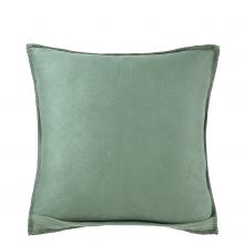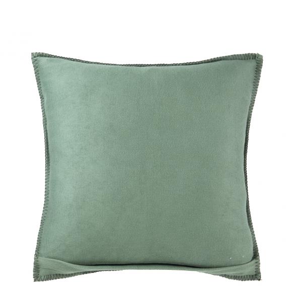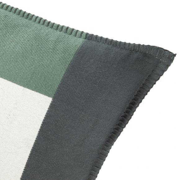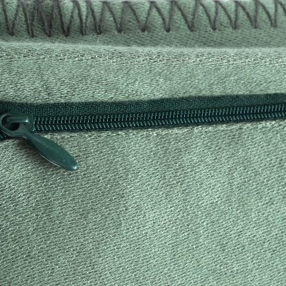 Cushion cover with front in jacquard fabric, back in solid color. Whipstitching finish and zipper closure at bottom, back side.