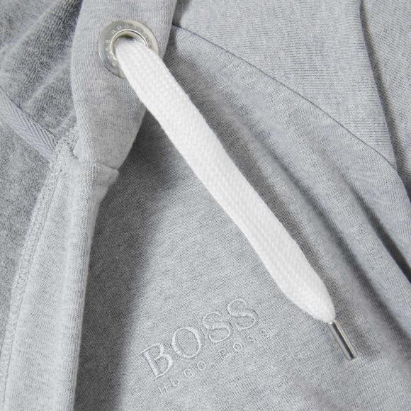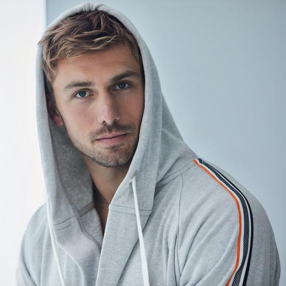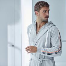The Paddy Robe is a hooded bathrobe with a sporty hoodie look and a fancy braid on the sleeves.