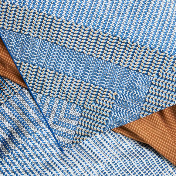Temere is a large chevron design made up from a rice like shape in blues and caramel colours.