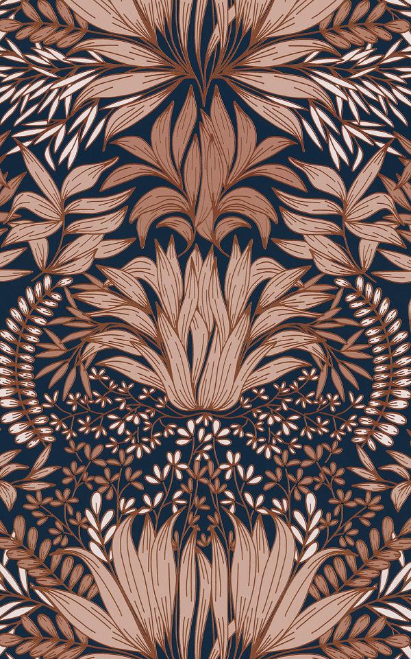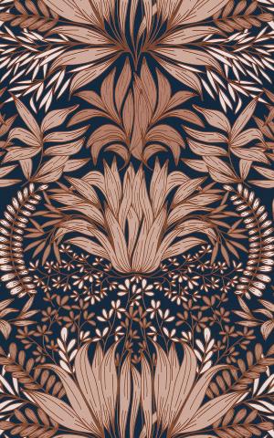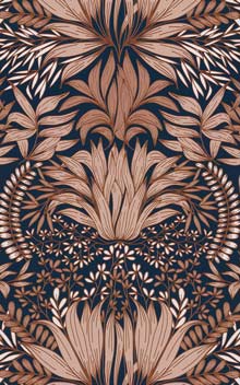 The sixteenth arrondissement in Paris is the home to many Art Nouveau mansions, notably the Villa Jassedé, found in rue Chardon-Lagache, once home to hector Guimard. Chardon is an ornamental design, inspired by the eponymous street and the artist movement which developed there. The design represents a flower in bloom, resting on the paper and surrounded by graceful foliage whose curves gently cover us. This feeling is heightened by the fibrous look of the base which is ideal for this design and highlighted with metallic inks.
