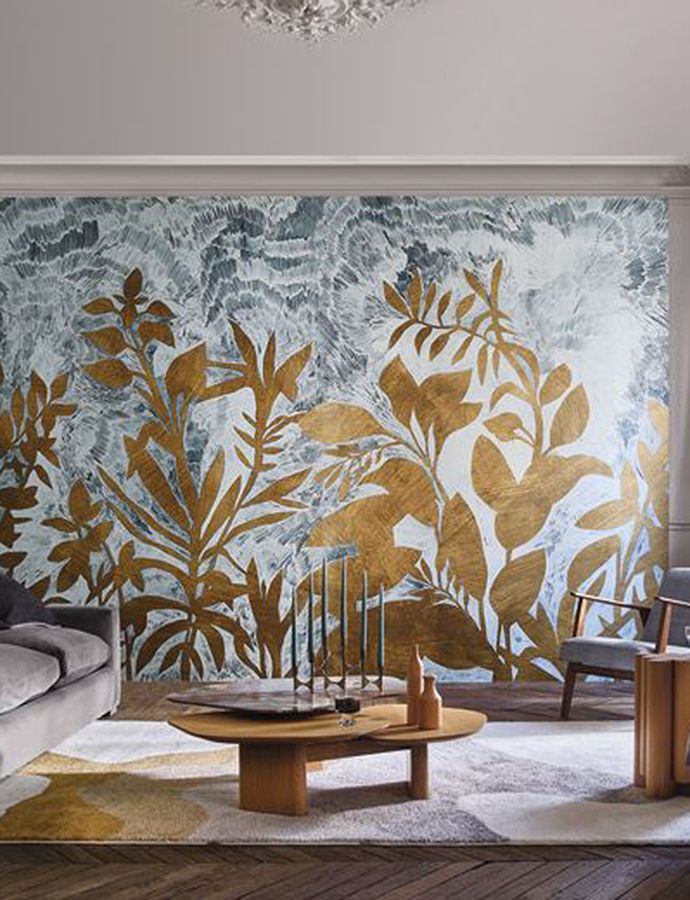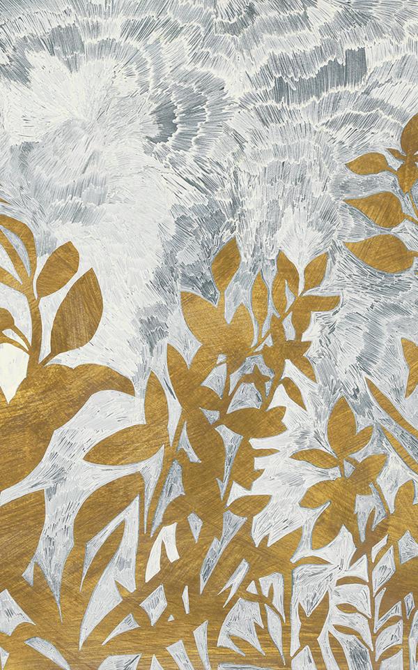 It only flowers at nightfall and releases its delicate fragrance into the air. The colour of its petals then becomes clear, enhanced by the moonlight. On a golden base, a digital print outlines its dramatic foliage. Its elegant silhouette spreads over the paper, its scale covering the walls with a precise and sophisticated display.