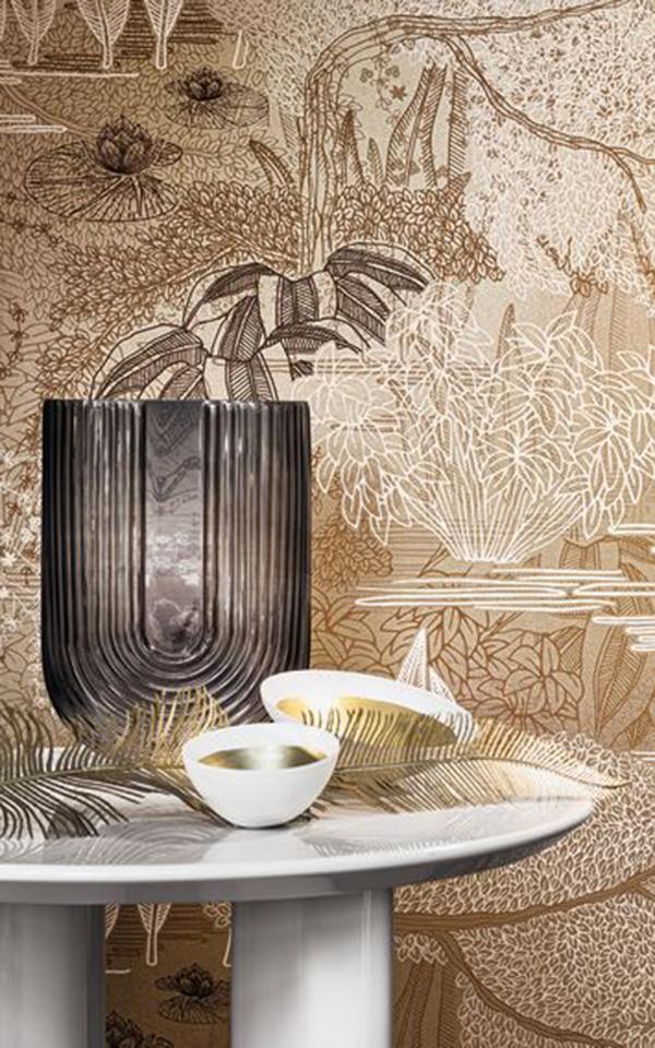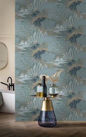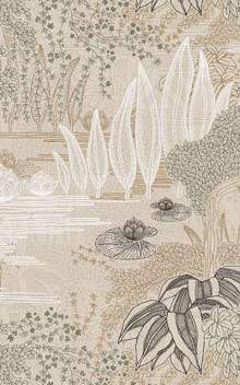 Continue ShoppingJasmin opens with sophisticated lines, accompanied by the softened presence of water. This design is the embodiment of a small Parisian mansion, designed in 1922 by the architect Hector Guimard at 3 Square Jasmin. Jasmin is a work of considerable finesse. A metaphor in the plant language of architecture, which uses ornamental shapes inspired by nature. The influence of Japanese art can be felt in the lightness of the composition, as well as the soft undulating lines, paired with the perspectives and the patterns. This design features Willows, Japanese Irises, Jasmin, and Reeds. The composition of this wallpaper, emphasises the water garden inspiration. Carefully curated with Guimard’s unique sense of detail. The paramount method of this print is to have five printing cylinders, which are necessary to creating this design. The details are emphasised with sandy and metallic inks, making the light shimmer on the foliage, and creating beautiful volume. One of the collection's version is available on a golden metallic base for an incredible statement piece in your Interior space.
