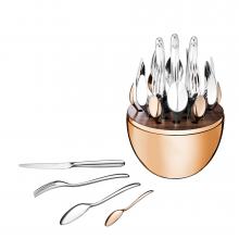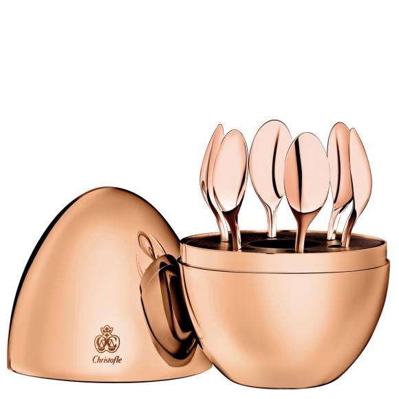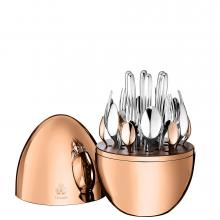 By combining its silver plated flatware with 18 carat rose gold gilded espresso spoons and a mirror polished copper coloured stainless steel egg chest, the Mood is certainly lifted.