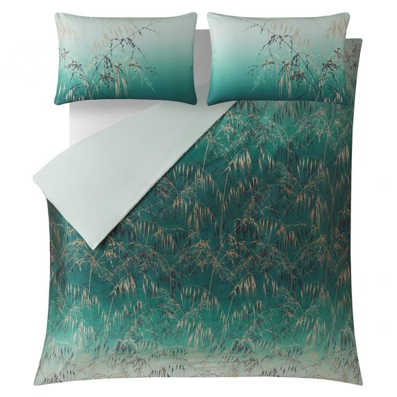Golden meadow grasses flow gracefully against the rich teal ombre background of this stunning bedding set.