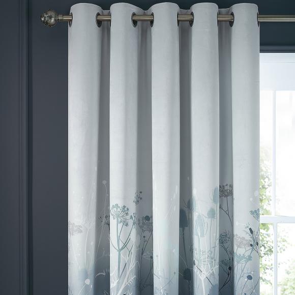These luminous velvet curtains, with a dusky blue and grey palette, evoke a wildflower meadow at close of day. A contemporary classic, it is instantly recognisable as a Clarissa Hulse design, with delicate botanical details illuminated by an ombre wash background. The striking natural design draws the eye down the length of the drapes, making an elegant and timeless addition to any room in your home. The velvet curtains are lined and available in three sizes. Matte silver eyelets provide a sleek, modern finish.