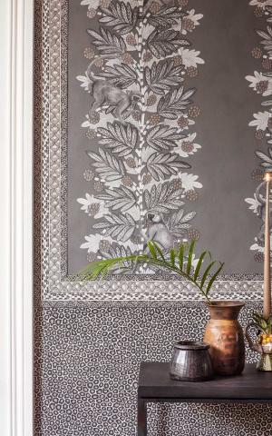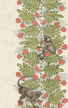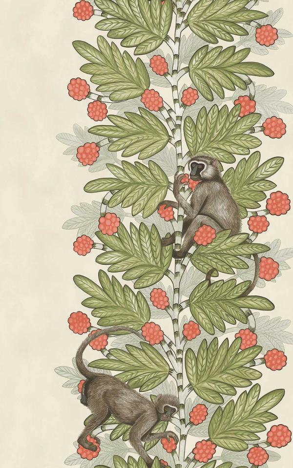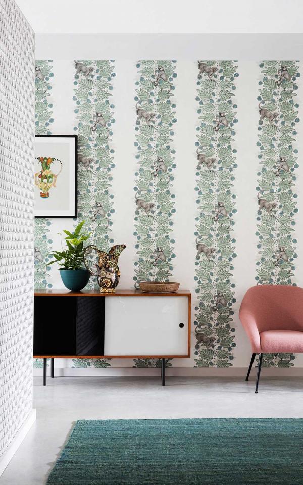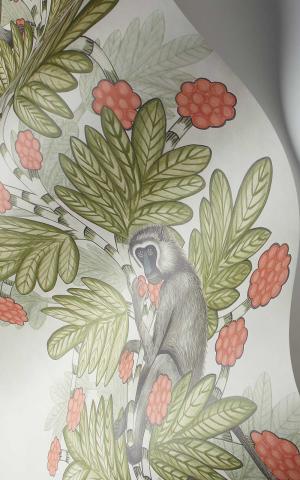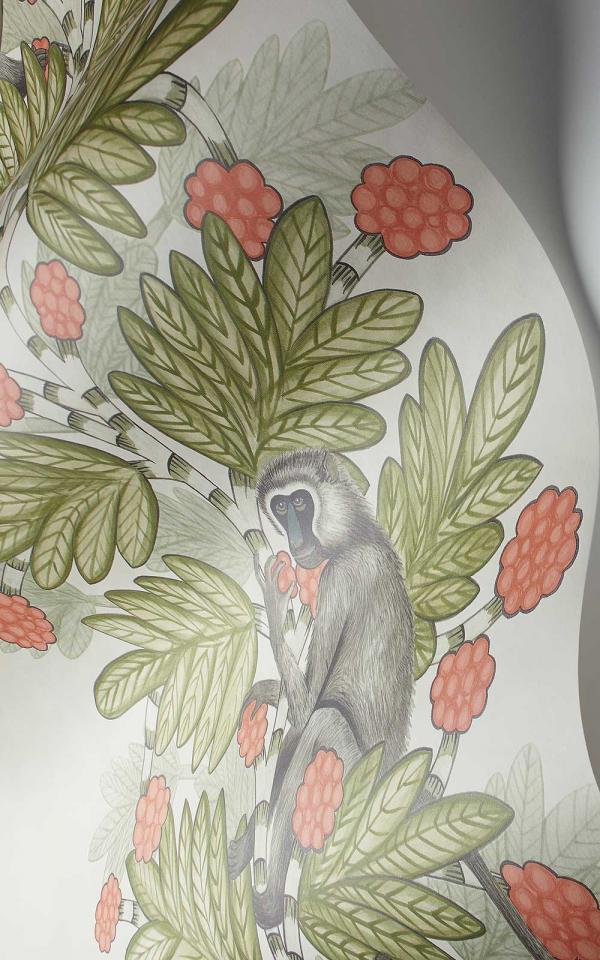 Having always had monkeys around her as a child, these humorous animals full of wit, pranks, and intelligence will always hold a place in her heart, and in turn have provided the inspiration for this striking, conversational wallpaper.