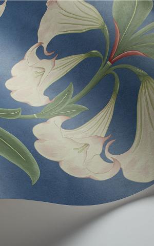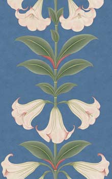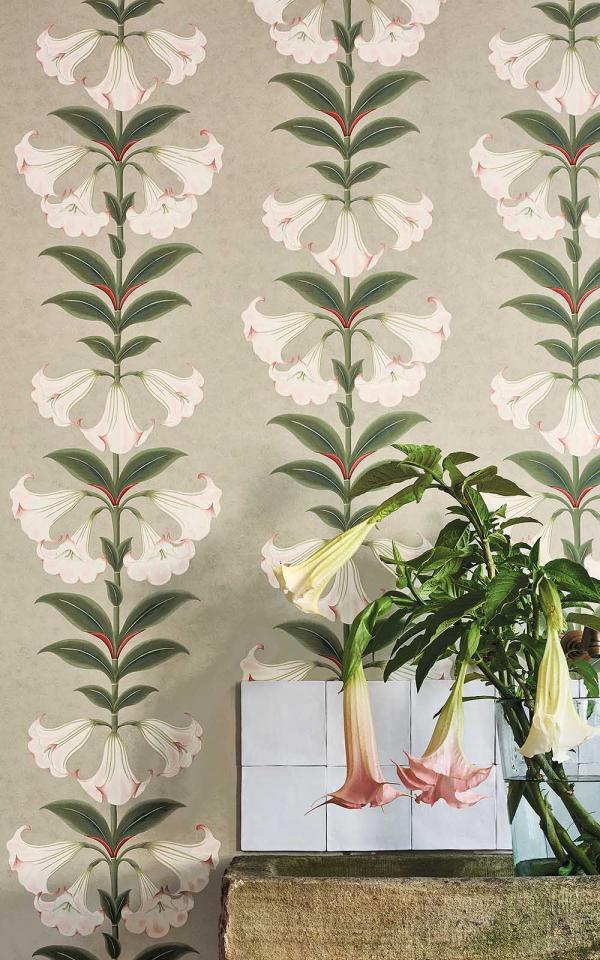 Native to the tropics of South America, Angel's Trumpet flourishes in the searing Sevillian heat of the Alcazar's courtyards and city gardens. Its feminine shape is enhanced by delicate, painterly details in pretty palettes of Cream & Olive Green on Charcoal; Chalk & Sage on Stone; Ballet Slipper & Sage on Cerulean Sky; and Coral & Viridian on Ink. Entirely hand-painted in a traditional botanical illustration style, Angel's Trumpet creates a beautifully bold, elegant floral stripe.