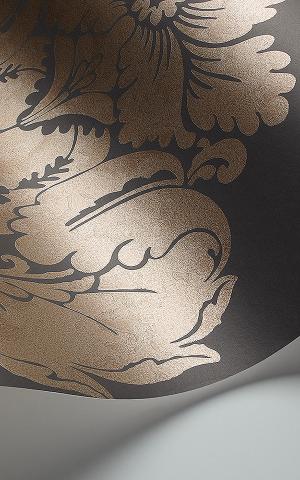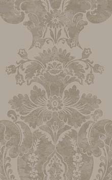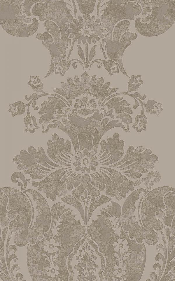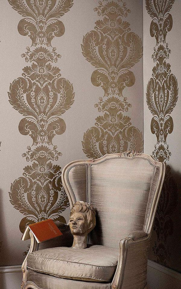 Baudelaire's print references the fashion for gilding with ornamental gold leaf and other precious metals. This elegant pattern of feathered plumes is designed as a panel and features burnished metallics on a range of neutral grounds. Available in colourways including Taupe, Parchment, Chalk, with soft metallics.