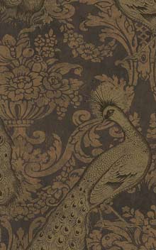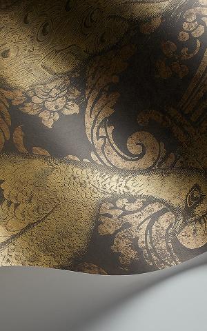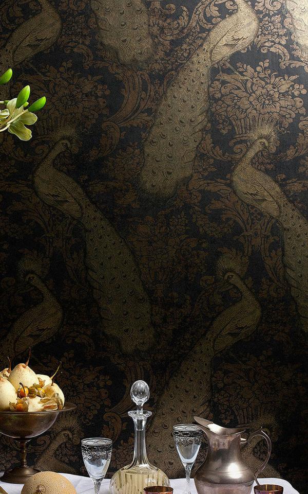 Byron is an elegant damask wallpaper featuring gilded peacocks in precious mineral hues. Inspired by the Victorian love of ornamental birds, Byron is opulent and exotic with its rich tones of Lilac Grey, Gilver, Petrol, Gold, Teal, and Silver.