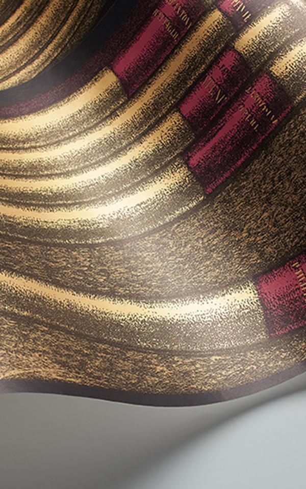 An avid collector of literature volumes on the applied arts, Fornasetti used books as a recurring theme which can be found throughout the Atelier's archive. The library Trompe l'oeil scene of Ex Libris, abundant in leather-bound books, is adapted from a 1953 screen.