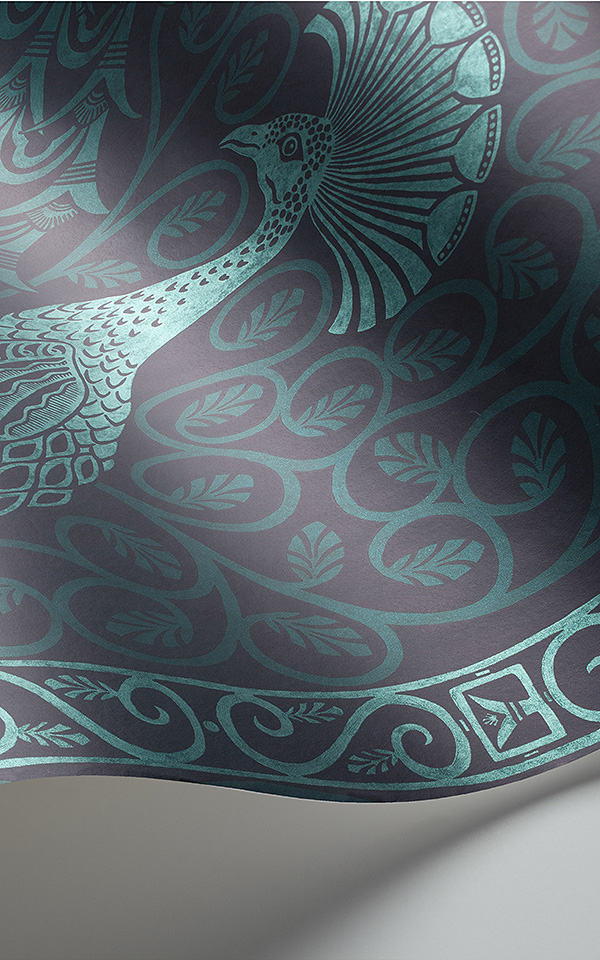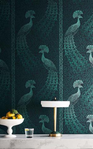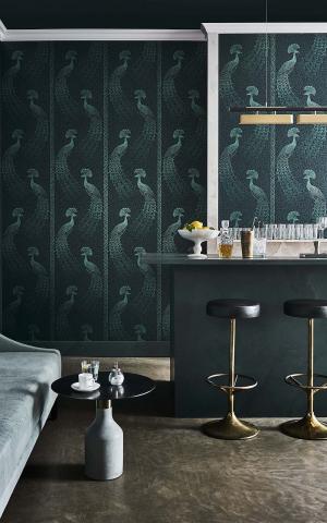 Taking its name from the peacock genus, Pavo Parade is an opulent host of metallic-toned peacocks. Their subtly ombred trailing tails pay homage to a technique pioneered by Cole & Son, whilst the subtle framing of the design creates a panel-like effect emphasising the birds' grandeur. Rich, lustred colourings of Metallic Silver on Denim; Metallic Bronze on Midnight; Metallic Gilver on Racing Car Green; Metallic Gold on Soot; as well as the arresting Metallic Petrol on Ink make this design a lavish interior option.