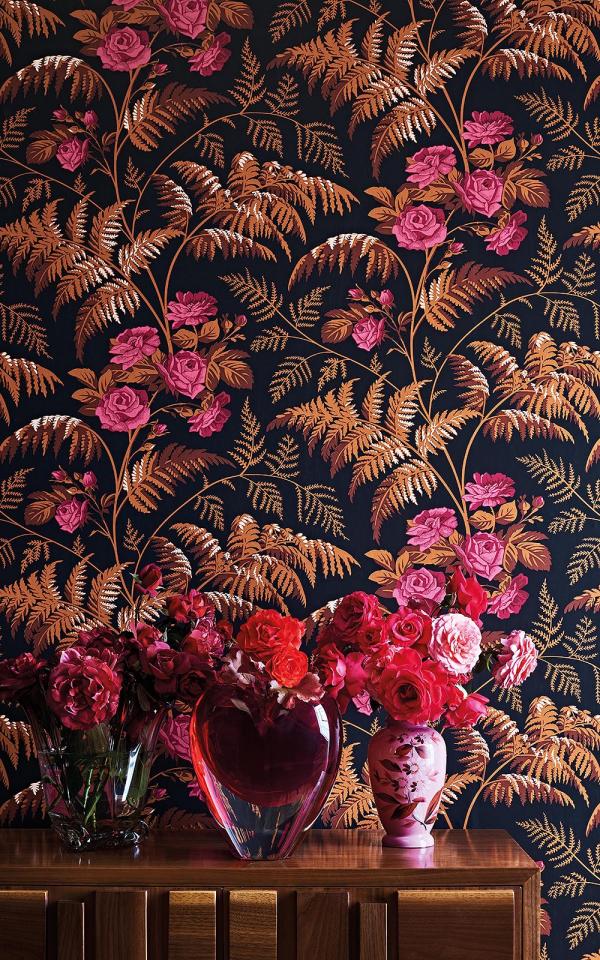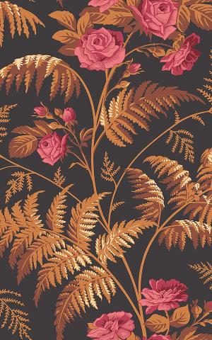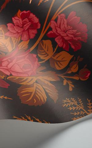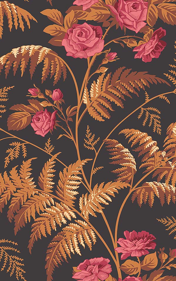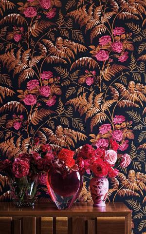Rose is an enchanting vertical trail design, combined with blooming roses, and fern fronds. Taking influence from nature, Rose exhibits a richly organic and detailed motif. This quintessential English pairing has been reimagined in an unexpected and contemporary palette of vivid Cerise & Burnt Orange on Black.
