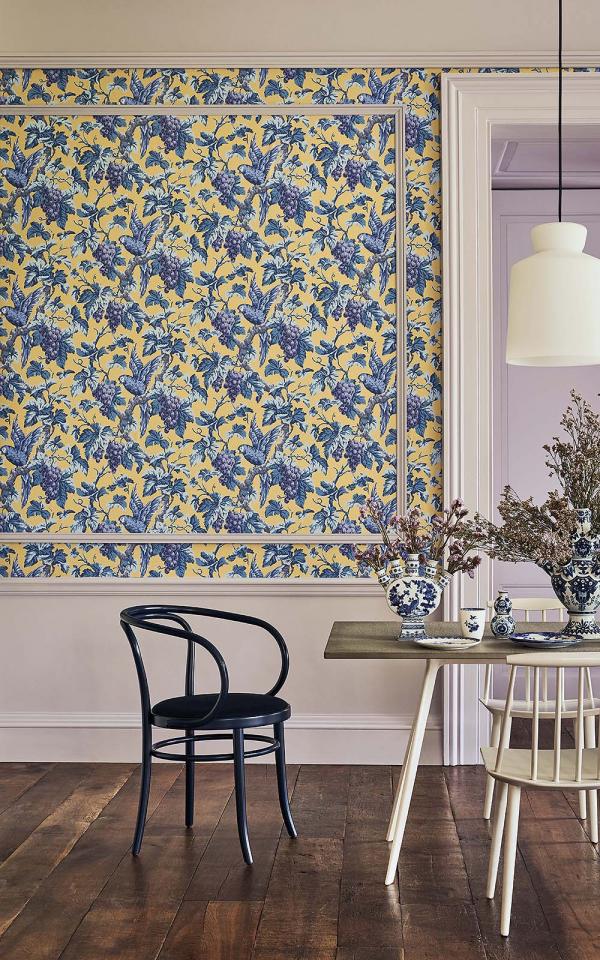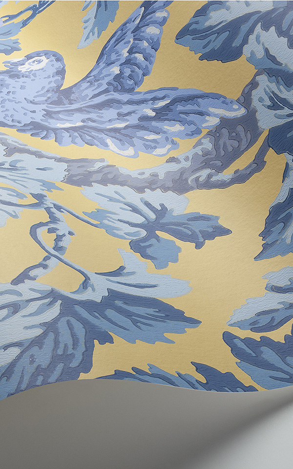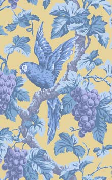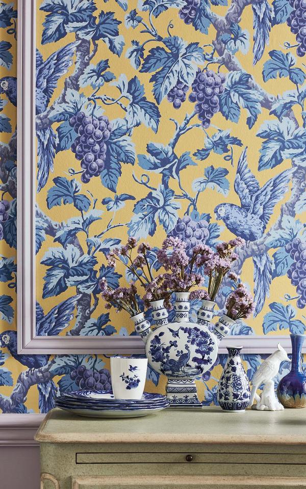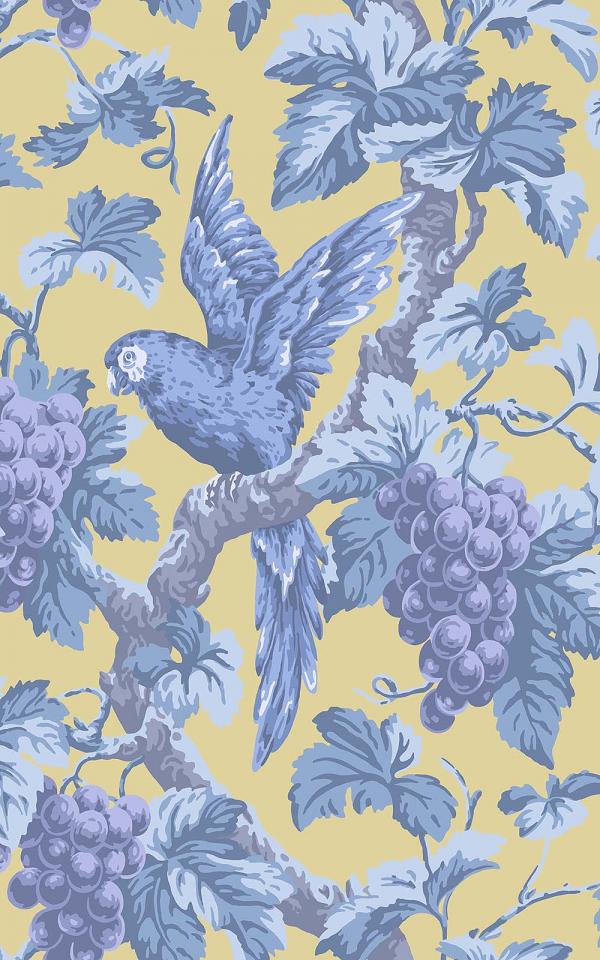 Continue ShoppingPlumose parrots sit amongst a flourishing canopy of leaves and sun-ripened grapes, surface printed to ensure the traditional print mark-making textures are retained in this modern day reproduction. Hues of Hyacinth, Lilac & China Blue on Ochre are full of summer sunshine, whilst the deep grounds of Violet, Purple & Forest on Ink; and Ruby, Rose & Olive Green on Charcoal, create an opulent interior, as does the classically elegant Rose, Hyacinth & Forest on Parchment.