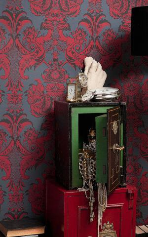 Continue ShoppingWyndham is a stylish floral damask cast in moody tones of Slate Grey, Cerulean Sky, Metallic Gold, Ruby, and pearly Mica. Wyndham was inspired by the decorative mouldings and gilding on display in the London theatre of the same name.