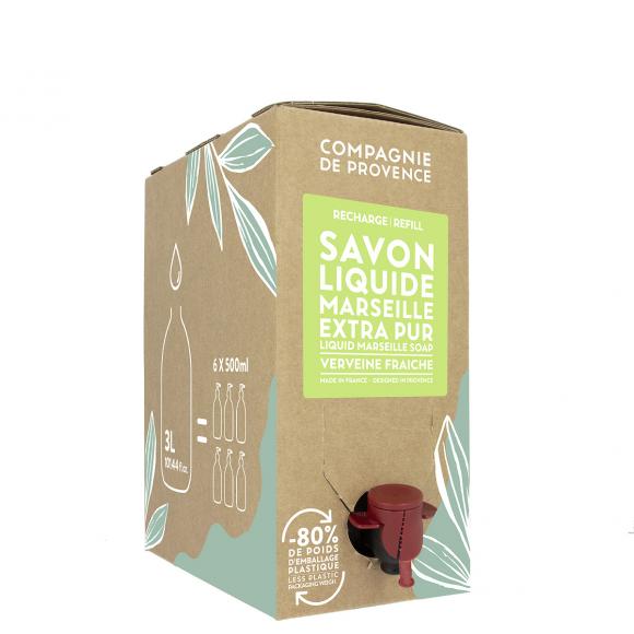 this 3L refill can fill a 500ml glass bottle of liquid soap 6 times and reduce the weight of plastic packaging by up to 80% compared to three La Compagnie de Provence litre refills.