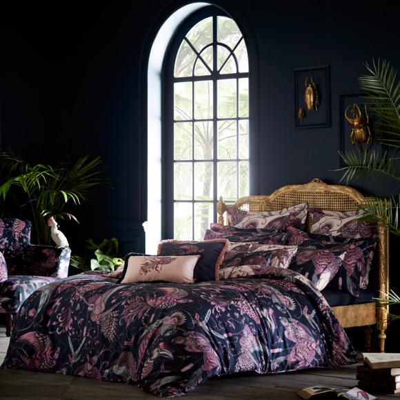 Create an exotic statement with the rich navy background on the front, or flip over to enjoy a softer, pink version on the reverse and let all your bedroom interior dreams come true..