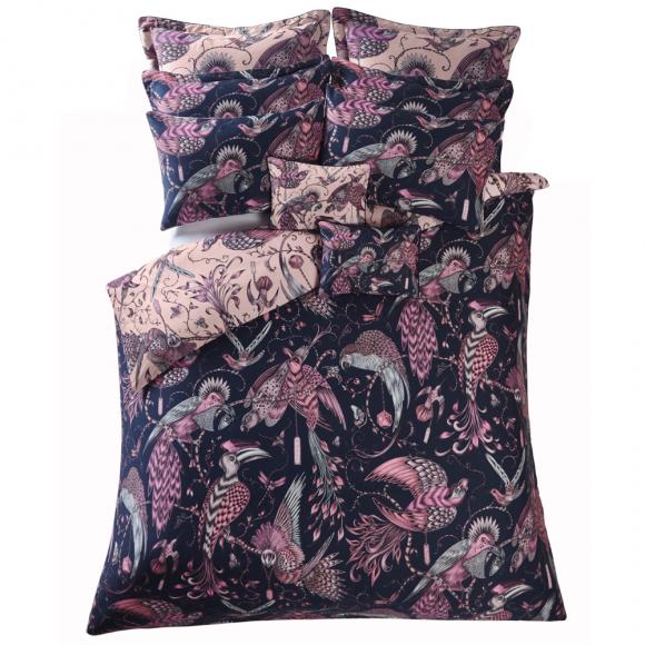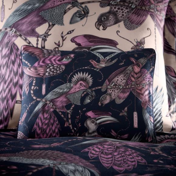 Boudoir Navy: The signature Audubon illustration adorns both sides of this 200 thread count cotton sateen pillowcase, edged with luxurious navy piping. Tonal pink feathered beasts soar atop a deep navy background in this dramatic colour scheme, perfect for making a bold interior statement.
