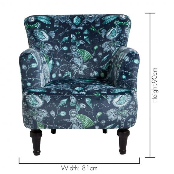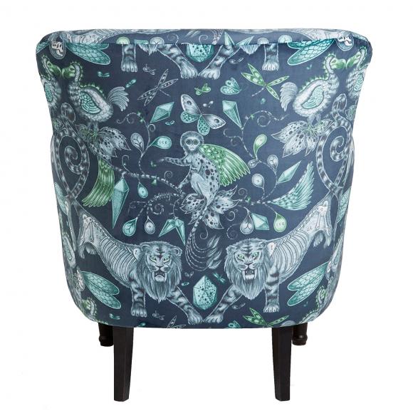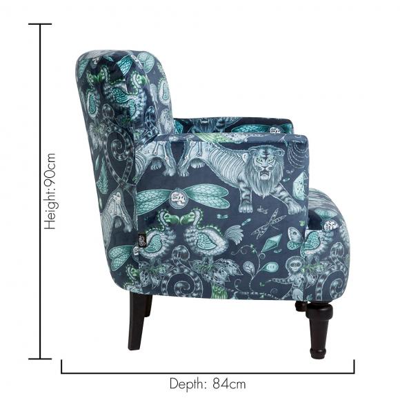 As part of the Emma J Shipley fantastical furniture range with Clarke & Clarke, the Extinct Dalston Chair is upholstered with the best selling velvet from the Animalia range. This design is inspired by extinct and half-imaginary animals such as the dodo, saber-tooth tigers, and flying monkeys, with notations influenced by the Ice Age.