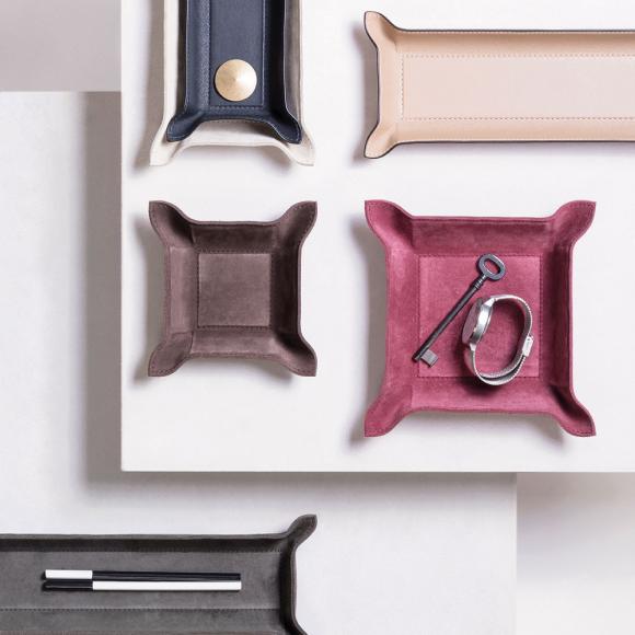 Crafted from luxury calfskin with a "Golf" or "Crocodile" textured print over a metal structure, the centre forms a rigid plate, whilst the sides are bendable and can be shaped to create a shallower or deeper tray.