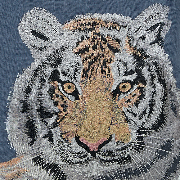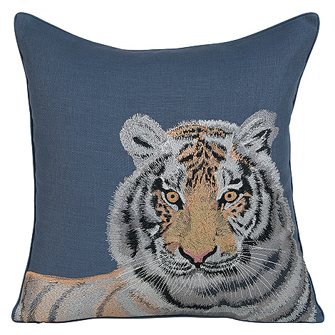A wondeful tapestry cushion by Iosis, featuring Gandji, the Tiger on the face side and Iosis ticking stripe on the reverse.