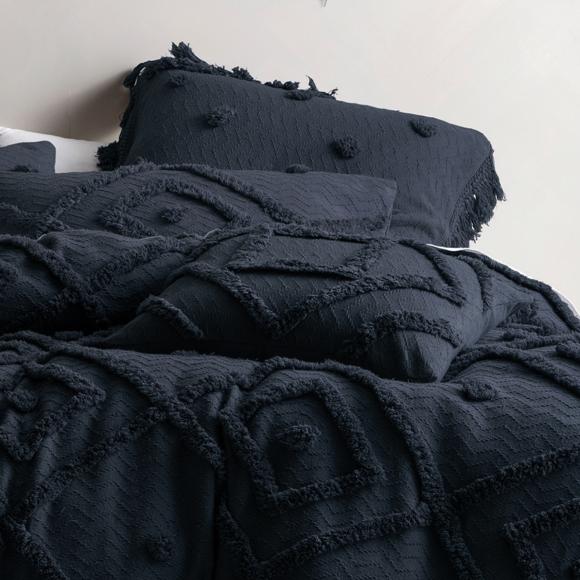 European pillowcases are finished with a knotted cotton fringe to add a relaxed vibe to this stylish bedroom look.