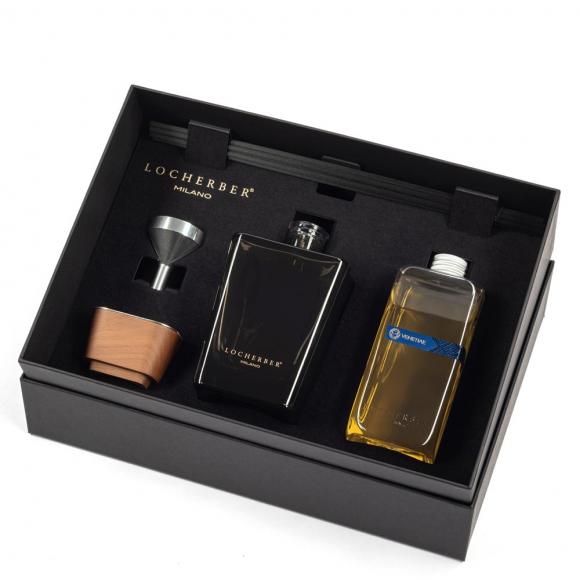 This attractive gift box presents an empty hand-painted brown glass jar in the new Skyline shape, a *canaletto walnut stopper, fibre sticks and a 500ml Smart Refill filled with the Venetiae fragrance.