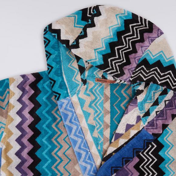 A lovely hooded bathrobe by Missoni, the Giacomo features the trademark Zig Zag Missoni pattern and a most beautiful combination of blue colours.