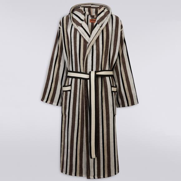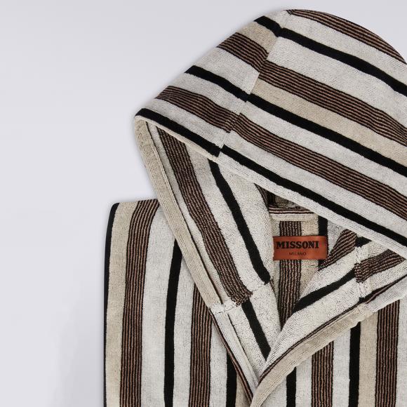 The Craig collection by Missoni features a modern, vertical stripe in a range of black, white and brown stripes. This bathrobe also features a hood for ultimate comfort.