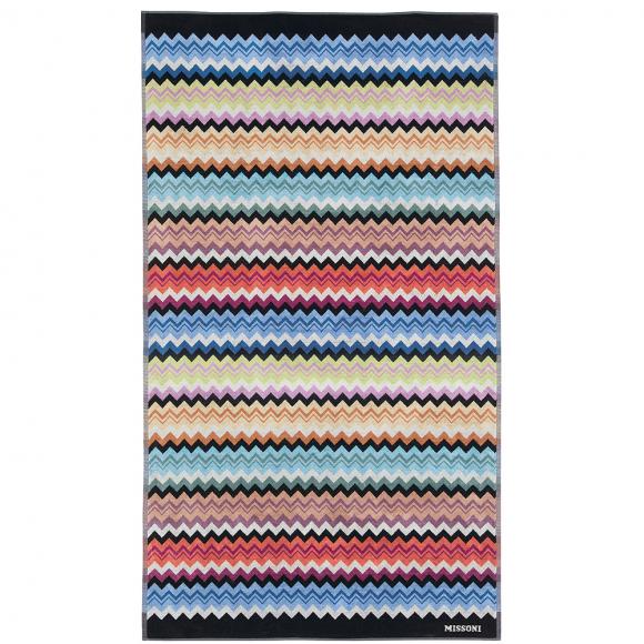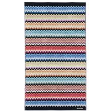 A variety of colours comprising of many colours from blues to oranges makes this towel truly unique and of course bright. Set as a striped design broken up by white lines in between. Missoni logo at the bottom of the towel.