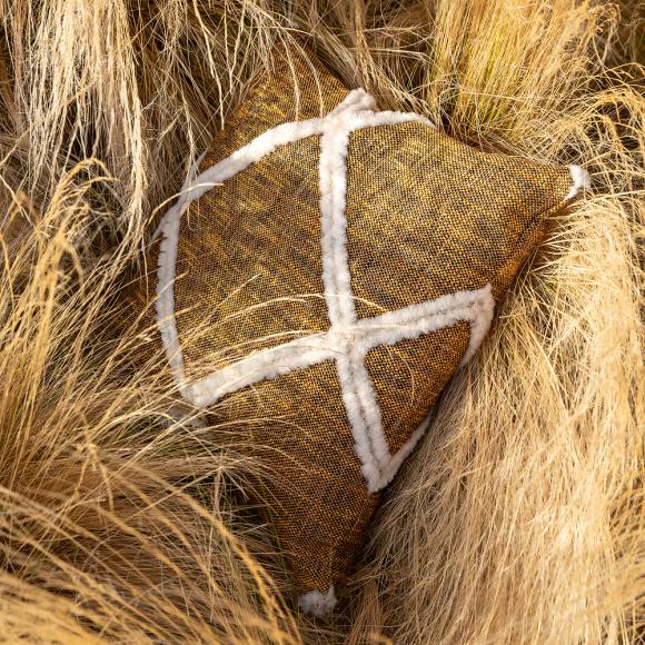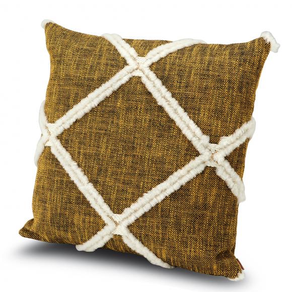 The Yujong cushion is made using an Iridescent jacquard fabric with a fil coupé wool diamond motif.
