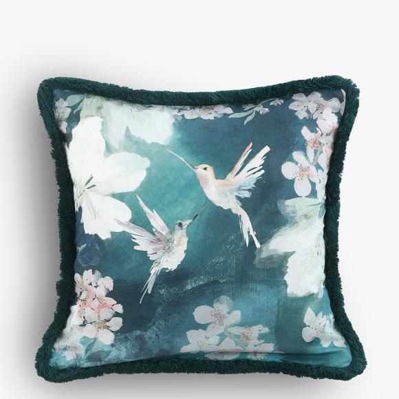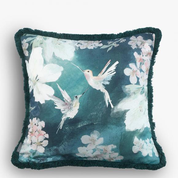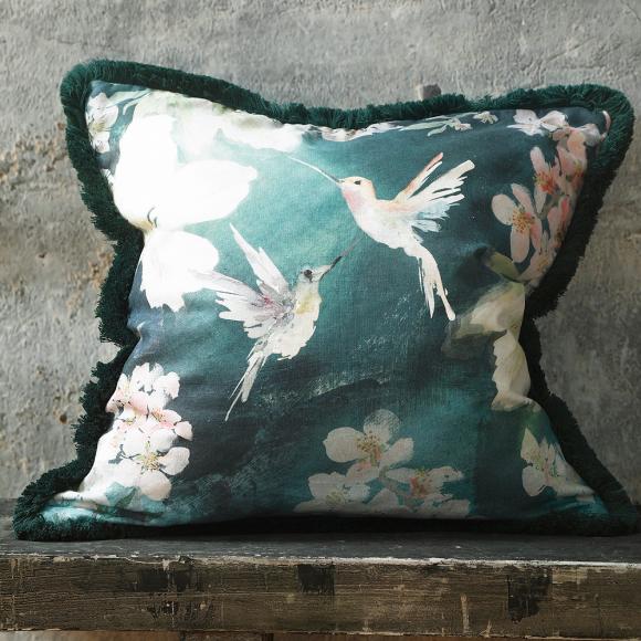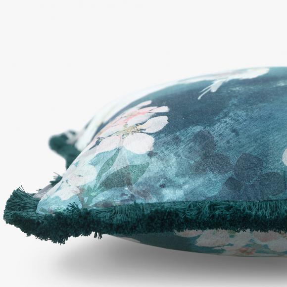 Printed in rich teals, blue and cream and edged with a dark green fringe, Avri is a pretty botanical cushion