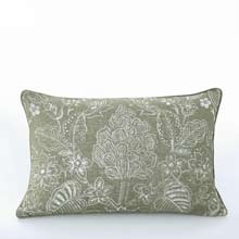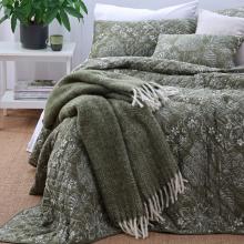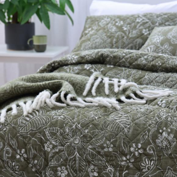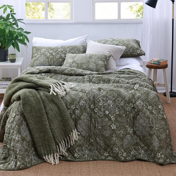 A quilted crisp and modern bedspread featuring a botanical composition with fresh white on a solid base with a plain green reverse side..