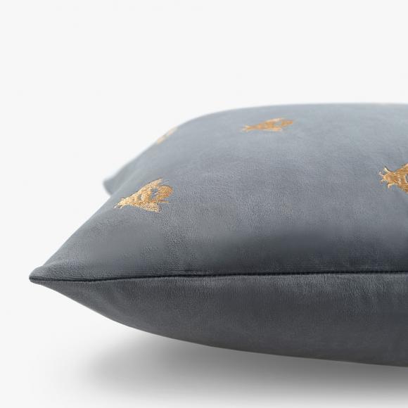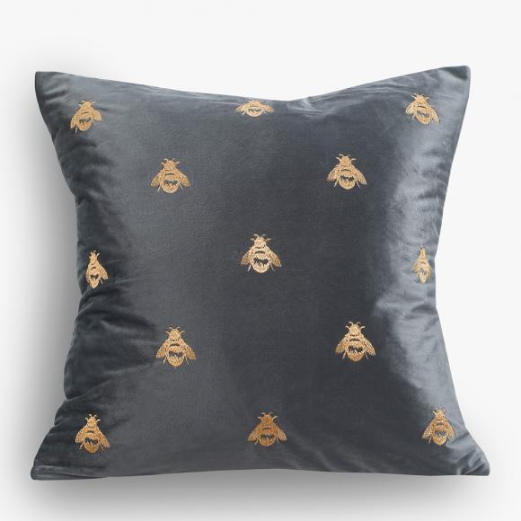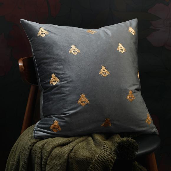Buzz is a sensational poly velvet cushion swarming with embroidered bees.