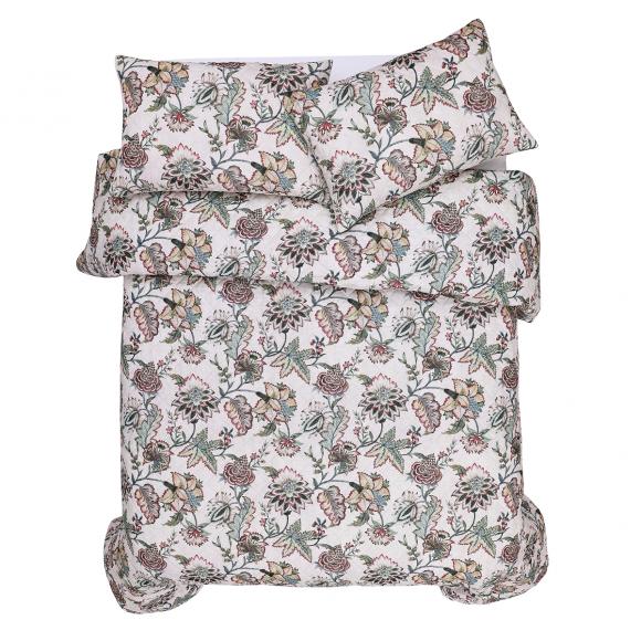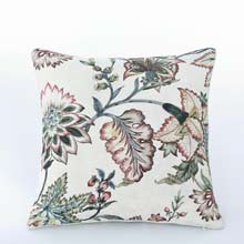 Modernised Jacobean scrolls, infused with soft blues, greens and reds, on a pale neutral base.