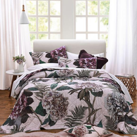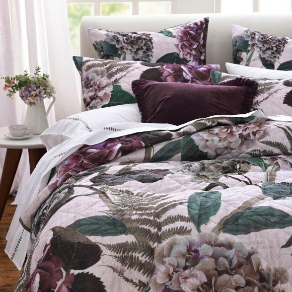 The Heidi bedspread set is adorned with large hydrangea blooms and ferns on a soft pink background. The saying of pretty in pink comes to mind when we think of this duvet set by MM Linen.